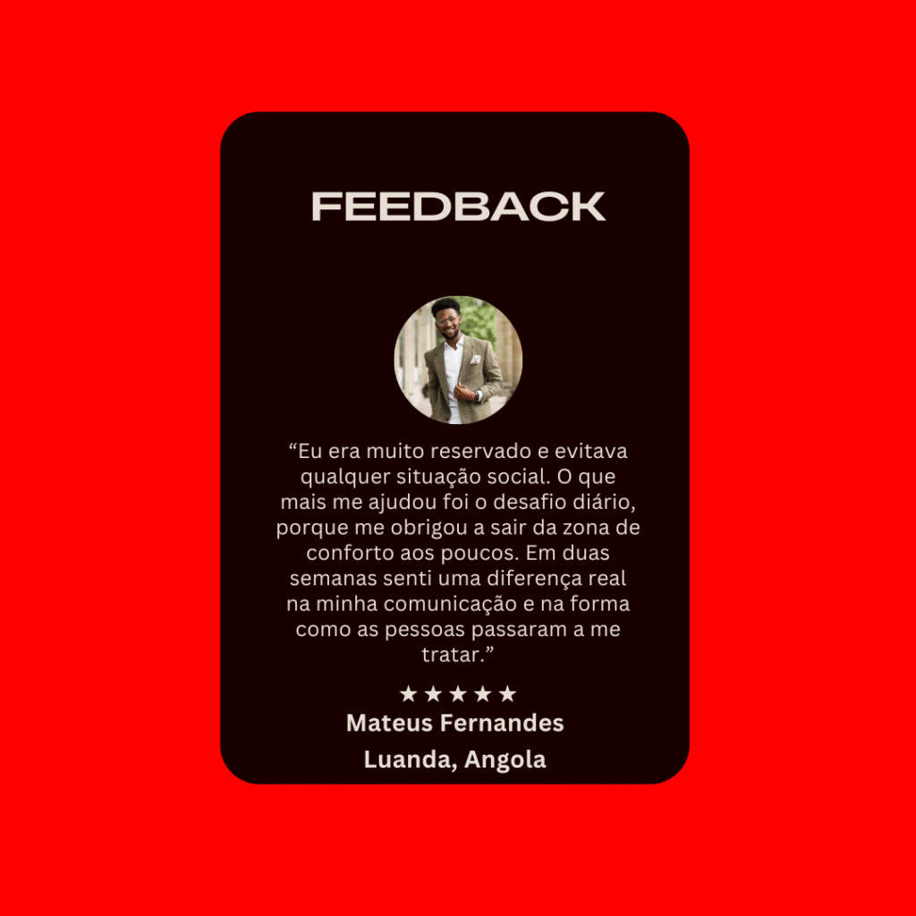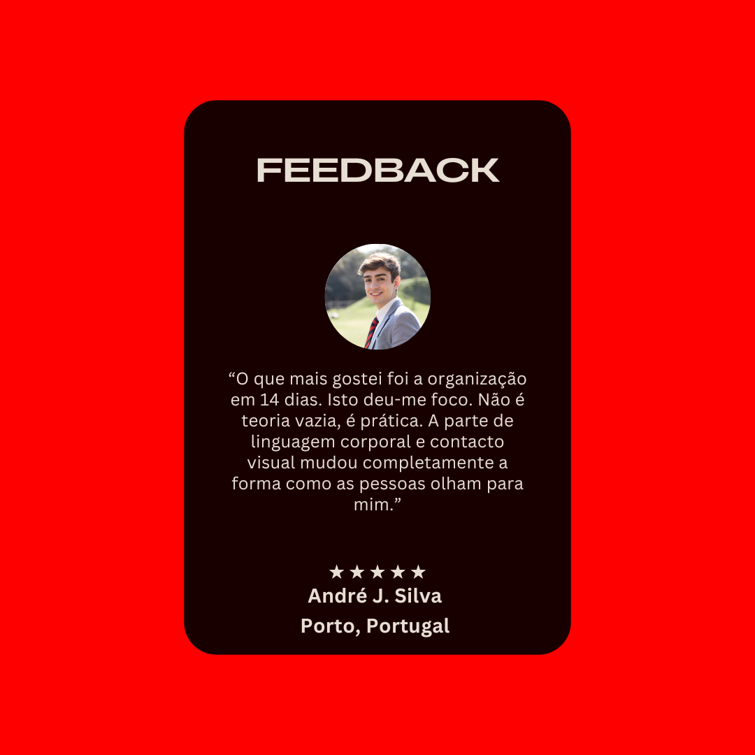 Você vai aprender como lidar com o medo do julgamento, melhorar sua postura e voz, e ganhar a segurança para se expressar com naturalidade, seja em conversas casuais, no trabalho, ou diante de um público.